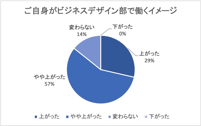 また、「プロジェクト参加前後で、当社ビジネスデザイン部で、ご自身が働くイメージの明確度は変化しましたか?」との問いに、参加学生の86%が、「上がった」「やや上がった」と回答しています。