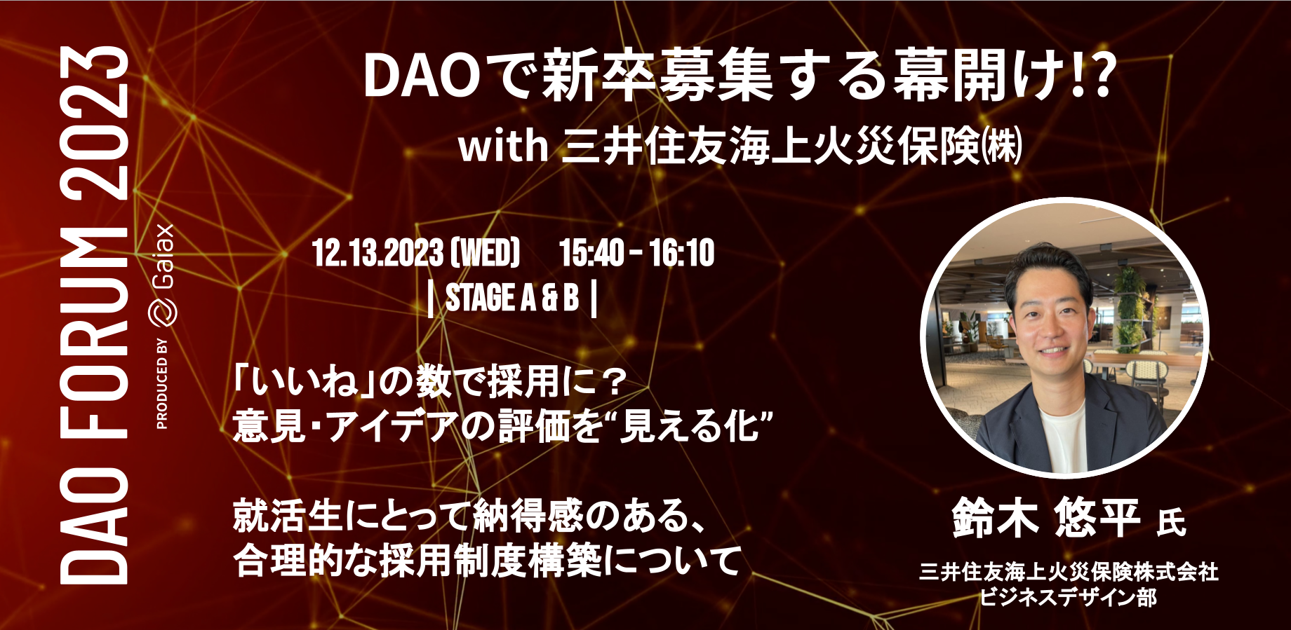 現在お申込み350名超、2023年12月13日(水)に開催の、DAO活用現場の最前線を取り上げる『DAO FORUM 2023』(オンライン&オフライン)内の「DAOで新卒募集する幕開け!? with 三井住友海上火災保険㈱」のセッションにて、三井住友海上 ビジネスデザイン部 鈴木 悠平 氏にご登壇いただきます。