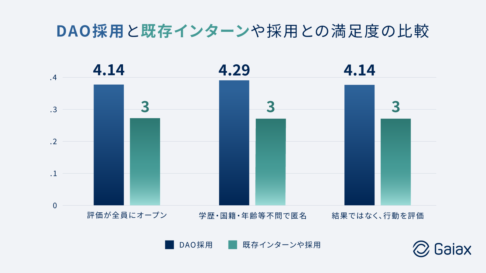 そこで、サンクストークンによって、何が評価されたのか、誰がどれくらい評価されているのかを常時オープンにしました。参加学生からは「既存のインターンや採用活動」を3点とした場合の「DAO採用」は、平均4.14点となり、従来の採用プロセスを大きく上回る評価結果となりました。また、採用DAO参加にあたり、学歴・国籍・年齢等が不問で匿名としたことに対しても、4.29点と高評価となっています。