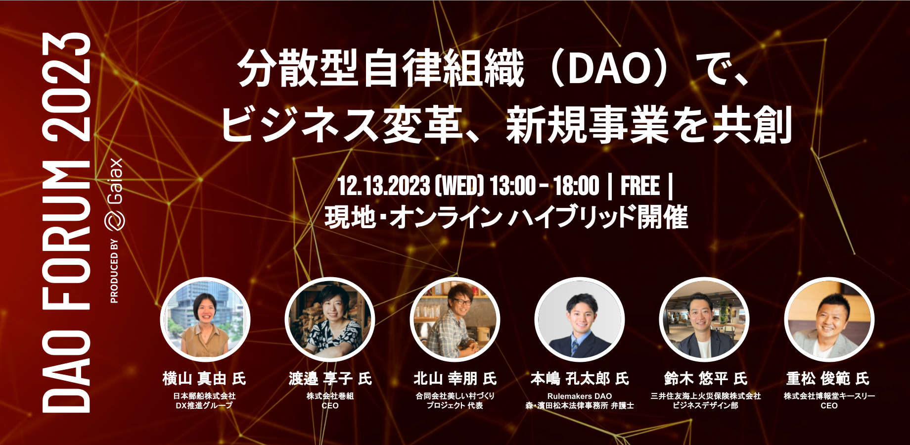 『DAO FORUM 2023』では、大手企業・自治体のDAO組成担当者がゲスト登壇するほか、DAOの法規制解説やDAOコンサルへの無料相談、ガイアックスが開発する新たなDAOツールの発表、DAO組成ワークショップなど、このフォーラムならではのコンテンツが詰め込まれています。