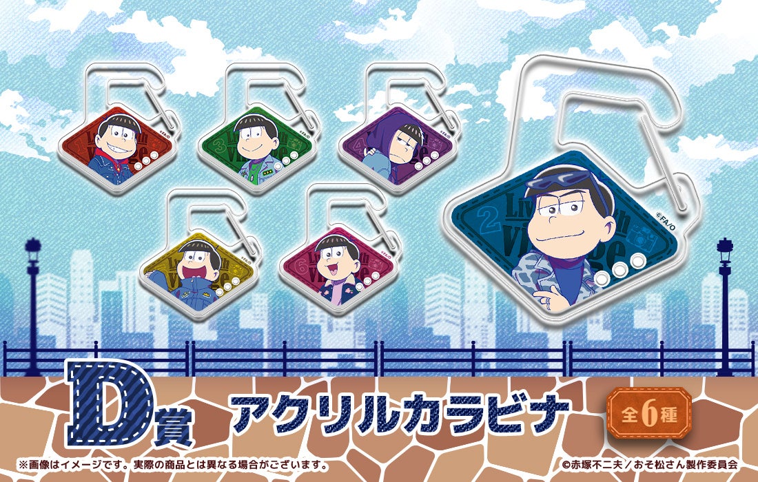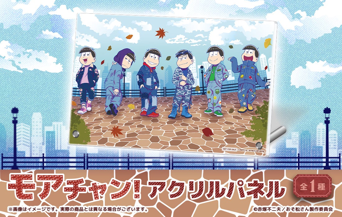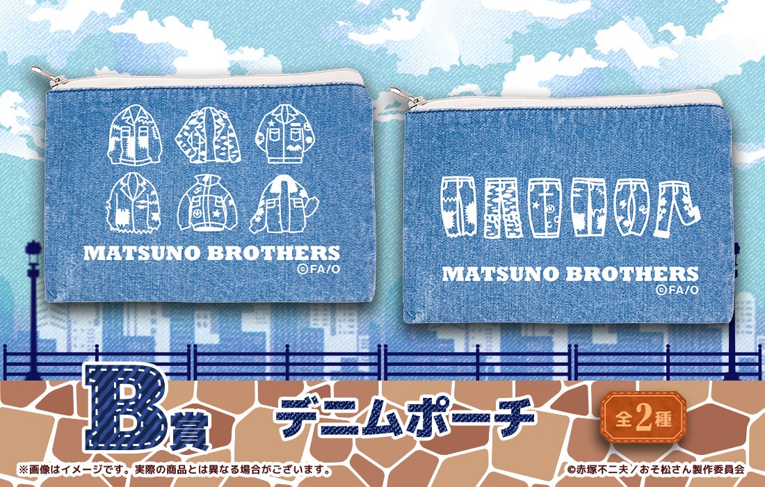 6つ子たちがおしゃれなヴィンテージデニム衣装に身を包み、街でストリートスナップを撮られているというイメージのもと、6つ子たちの衣装がプリントされたデニム素材のフラットポーチ、バッグなどにつけることができるアクリルカラビナ、ジーンズのタグをイメージしたアクリルキーホルダーなど、全体的におしゃれなイメージにデザインされたグッズをラインナップ!
