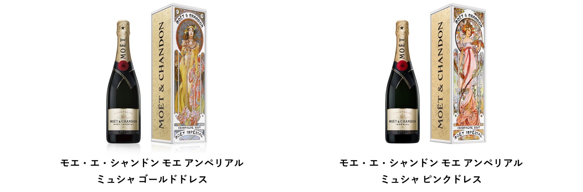 メゾン創業280周年を迎える節目の年に、20世紀初頭にアルフォンス・ミュシャがモエ・エ・シャンドンのために描き下ろしたポスター画を再現した「モエ・エ・シャンドン モエ アンペリアル ミュシャ デザインボックス」を発売致します。華やかなゴールドドレスと、優しくあたたかみのあるピンクドレスの2種類のデザインのギフトボックスは、自然からインスピレーションを得た美と豊かさの象徴としてエレガントな女性を描いています。華やかで流れるようなドレスに身を包み、一人はブドウの房を、もう一人は花瓶を手にしたその姿は、モエ・エ・シャンドンが初めてアーティストコラボレーションしたアルフォンス・ミュシャによって、モエ・エ・シャンドンらしいスケール感とエレガンスそしてクリエイティビティを伝えています。