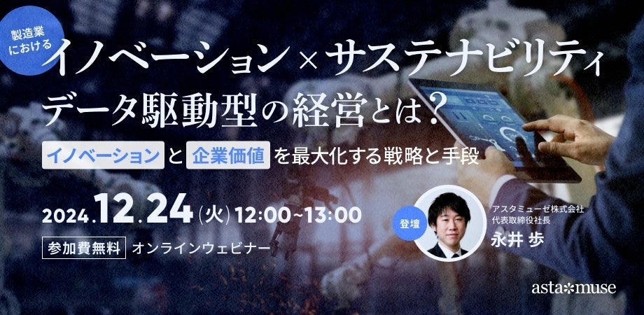 アスタミューゼ株式会社(本社:東京都千代田区、代表取締役社長 永井歩)は、2024年12月24日(火)12:00-13:00に、無料ウェビナー「製造業における「イノベーション × サステナビリティ」データ駆動型の経営とは?~イノベーションと企業価値を最大化する戦略と手段~ 」を再開催いたします。