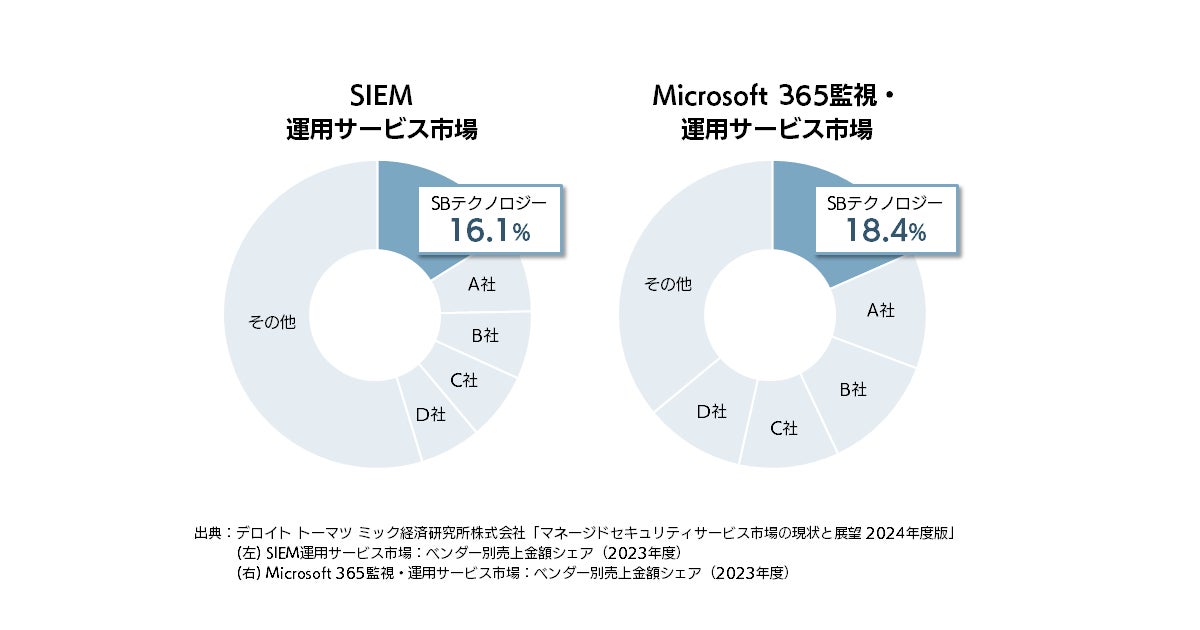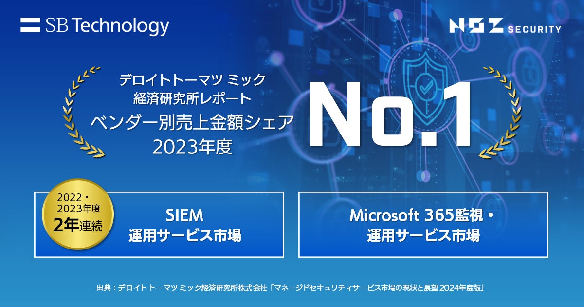 SBテクノロジー株式会社(本社:東京都新宿区、代表取締役社長 CEO:阿多 親市、以下 SBT)は、デロイト トーマツ ミック経済研究所株式会社(以下、ミック)が2024年12月に発行した市場調査レポート「マネージドセキュリティサービス市場の現状と展望 2024年度版」(以下、本レポート)において、2023年度のSIEM運用サービス市場とMicrosoft 365監視・運用サービス市場の売上金額シェア1位を獲得しました。