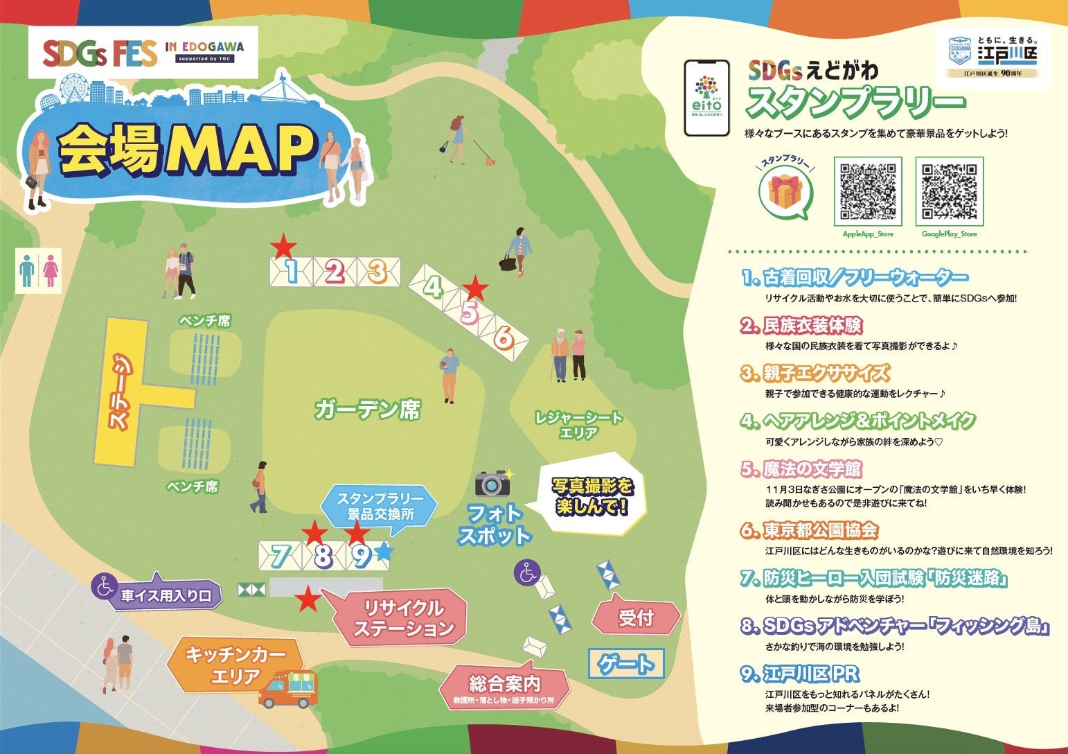 SDGs FESの会場MAPを大公開!会場内には、「SDGsえどがわ10の行動」を自然に楽しみながら学ぶことができる様々な体験型ブースの設置をはじめ、SDGs FESを1日中満喫できる様々な施策をご用意しています。