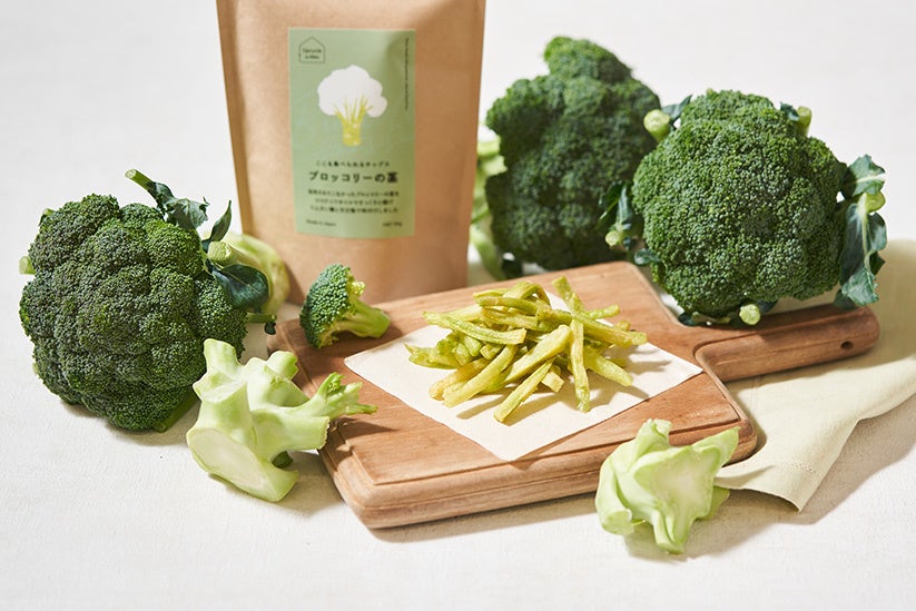 冷凍ブロッコリーのカット工場で花蕾をカットしたあとに残る茎をスティック状にして特殊フライヤーで低温フライすることで、サクサクした軽い食感のチップスにしました。 揚げ油はココナッツオイルを使用し、てんさい糖と塩で少し甘めに味付けています。