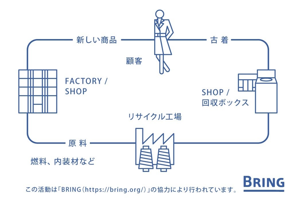 株式会社JEPLAN(旧社名 日本環境設計株式会社)が運営する「BRING」は、繊維製品を地球の資源へとリサイクルするために、様々な企業同士が連携し、お客さまと一緒になって取り組むプロジェクトです。プロジェクトの参加企業は、お客さまが店頭などに持ち込んだ繊維製品を回収し、服の原料や自動車内装材などにリサイクルします。