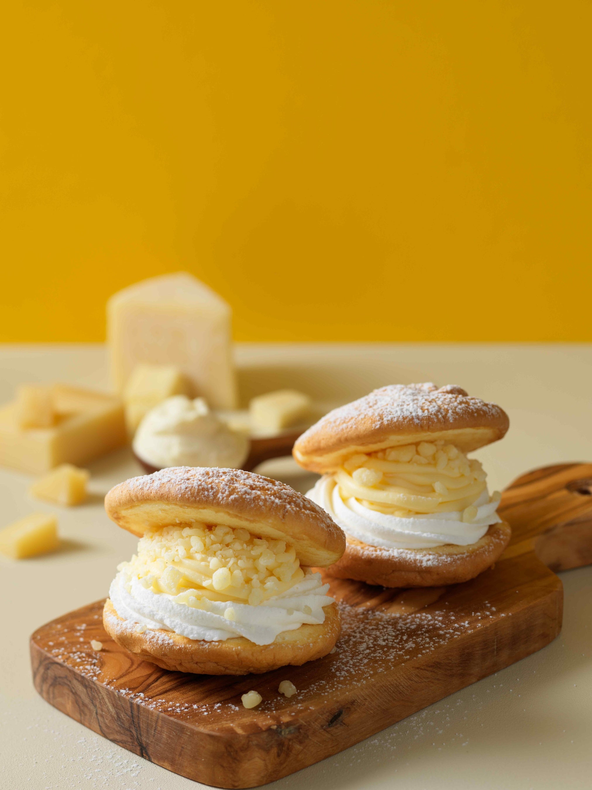 チェダーチーズパウダーとアーモンドパウダーを加え、焼き上げたブッセ生地は、噛むほどに感じるチーズの風味と優しい甘さ。チーズの風味豊かなバターチーズクリームは、カマンベール、ゴーダチーズを合わせました。チーズとバターの奥深い味わいに満たされる、ブッセスタイルのチーズクリームスイーツです。