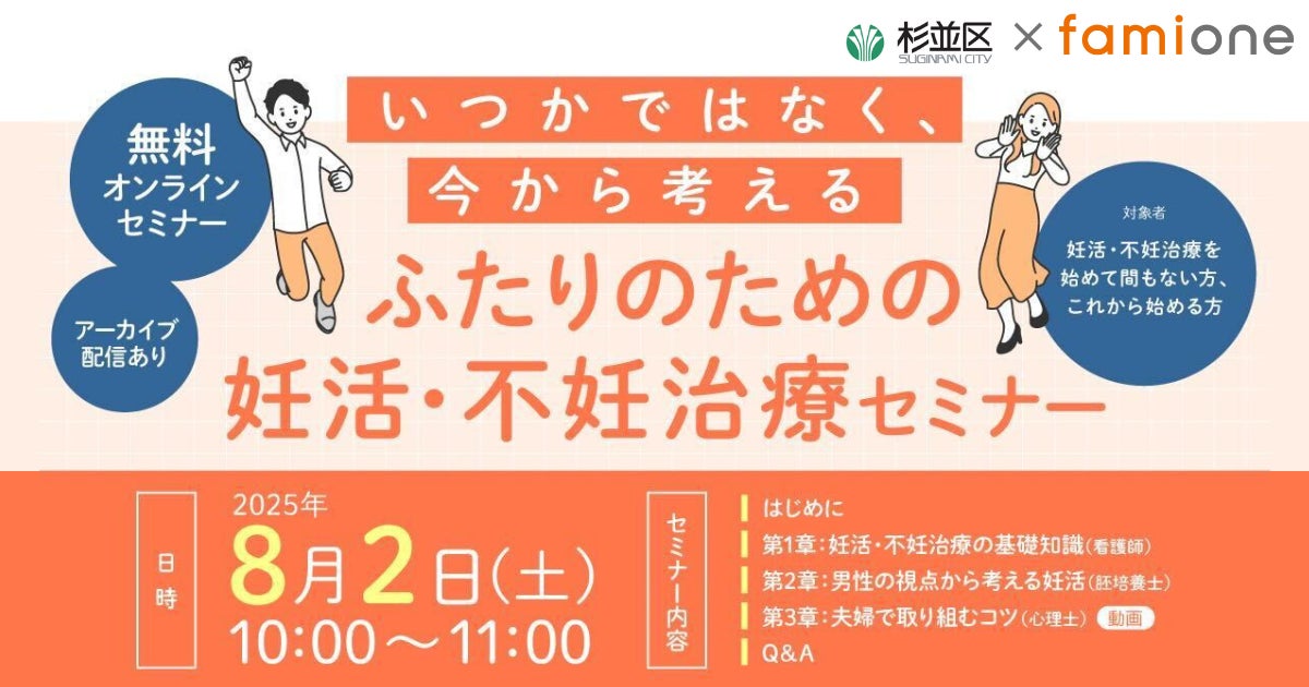「子どもを願うすべての人によりそい 幸せな人生を歩める社会をつくる」をビジョンに掲げ、法人の従業員向け福利厚生や自治体の住民向け支援を行うヘルスケアサポートサービス「ファミワン」 https://famione.com/benefit/ などを展開する株式会社ファミワン(本社:東京都渋谷区、代表取締役:石川勇介)は、東京都杉並区の「妊活LINEサポート事業」の一環として杉並区在住・在勤・在学の方で妊活・不妊治療に関して興味がある方向けに妊活・不妊治療セミナーを開催いたします。
