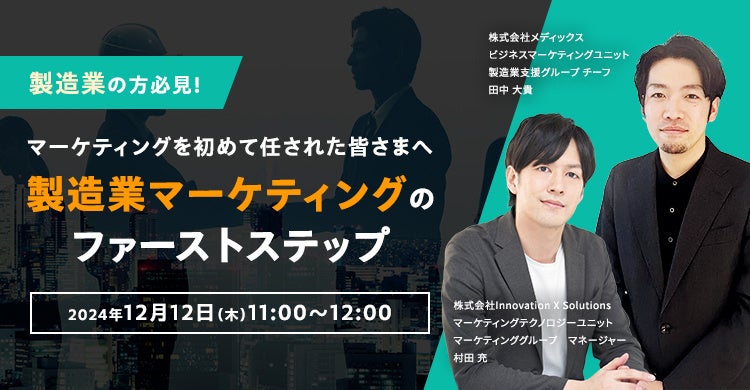 株式会社イノベーション(東証グロース 証券コード3970)のグループ会社である、株式会社Innovation X Solutions(本社:東京都渋谷区、代表取締役社長:歐陽 聖司、以下「Innovation X Solutions」)は、「~ マーケティングを初めて任された皆さまへ~ 製造業マーケティングのファーストステップ」をテーマとしたセミナーを2024年12月12日(木)に開催します。