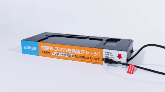 客席に設置する充電ボックス内には、Ankerの最大67W出力に対応した電源タップを設置し、スマートフォンやタブレット等を急速充電できます。また充電BOXにはマグネット式のケーブルホルダーを備えており、使用前後のケーブルをスマートに収納可能です。