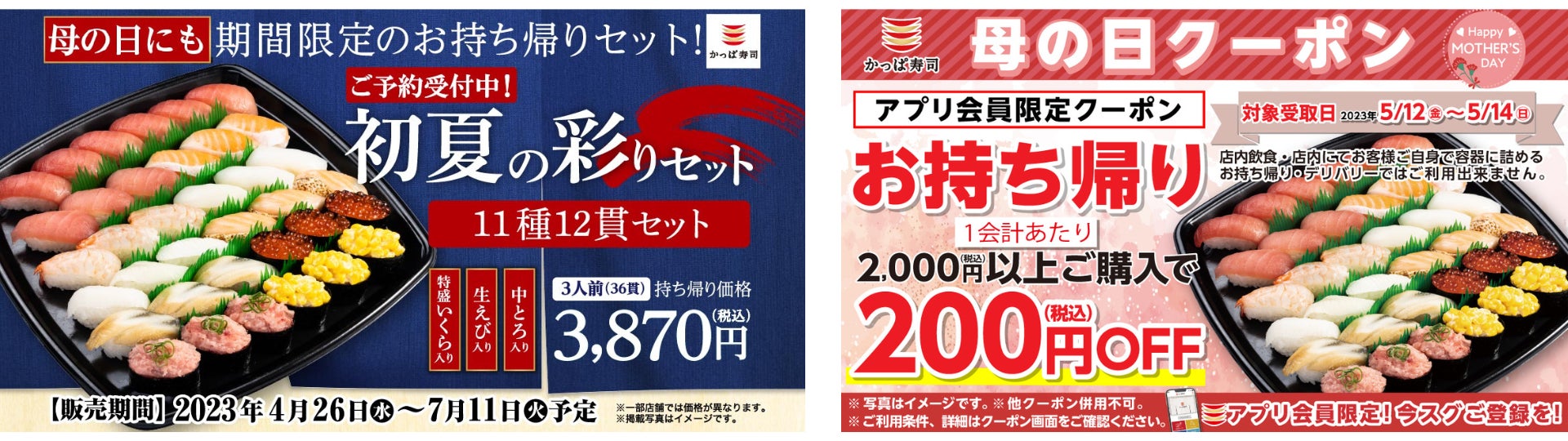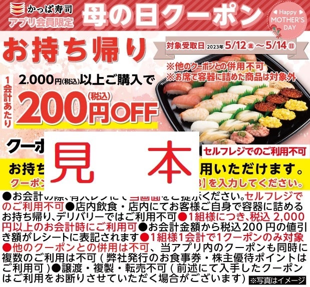 今回、2023年5月10日(水)~5月14日(日)の5日間、かっぱ寿司アプリ会員限定『母の日クーポン』を配信し、2023年5月12日(金)~5月14日(日)にお受け取りのお持ち帰り商品を2,000円(税込)以上ご購入いただくと200円(税込)OFFとなるキャンペーンを開催いたします。