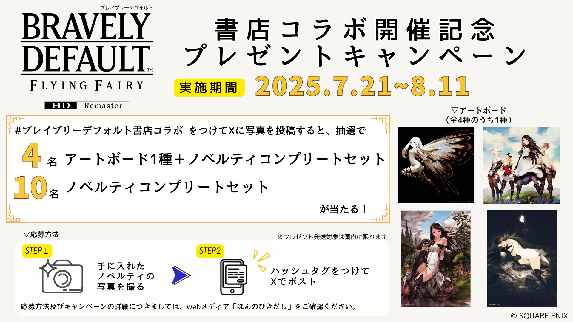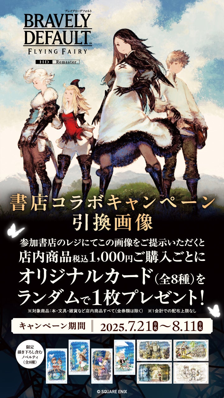 日本出版販売株式会社(代表取締役社長:富樫 建、略称:日販)は、株式会社スクウェア・エニックス(代表取締役社長:桐生 隆司)が手掛けるRPG『ブレイブリーデフォルト フライングフェアリー HDリマスター』の発売を記念して、2025年7月21日(月)より全国54書店にて、商品ご購入時にオリジナルカードがもらえる書店コラボキャンペーンを実施します。