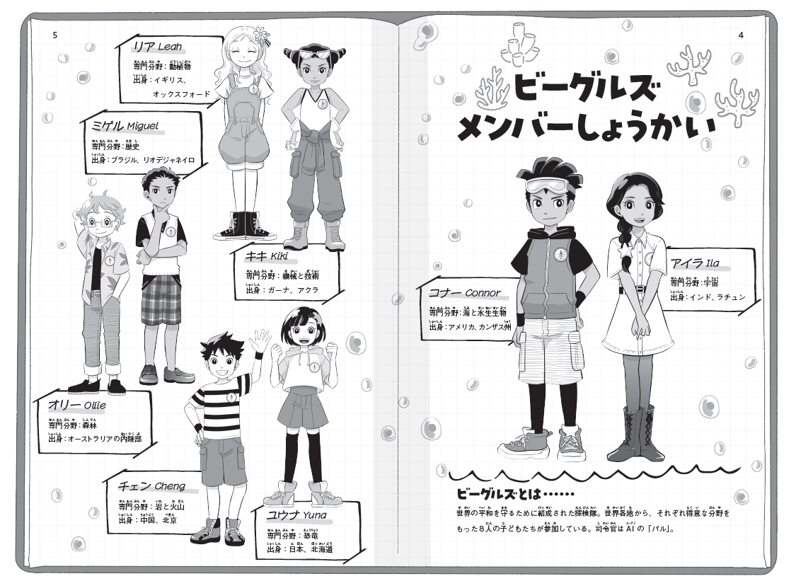 世界各地でくらす8人の子どもたちは、呼び出しがあると、光り輝く扉を抜けてステーションに集結する。彼らの名前は「ビーグルズ」。生物、宇宙、恐竜、岩石…など得意分野を持った子どもたちによって組織された秘密の探検隊だ。
