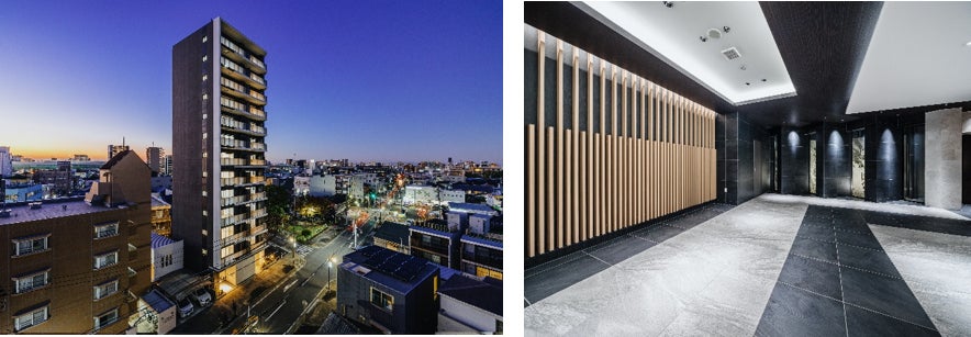 建物は地上13階建・全24邸。パークサイドと2方接道の開放的な角地で独立感とセキュリティ性にも重視したランドプラン。また、外観はグレーのタイルを基調にブラックを挿し色とすることで、建物としての揺るぎない輪郭を際立たせるデザインです。エントランスまわりの基壇部にオフホワイトの大判タイルを、エントランスホール内には四間道の街並みをイメージした木調のルーバーが重なる意匠で上質なあたたかみを演出するなど多彩なマテリアルを使用しました。