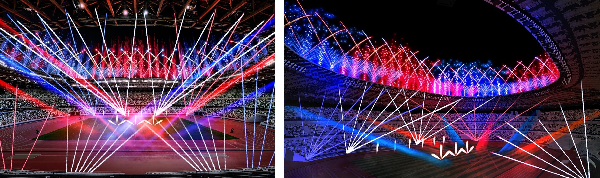 スタジアム屋根上からは、360度の角度から約1100発の特殊効果花火の打ち上げを実施。同時に、計28台のムービングライトやレーザーによる照明の演出を行います。また、ピッチサイドでは迫力のある炎による演出も。