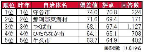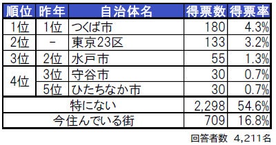 研究学園都市として発展し続け、今なお人口が増加しているつくば市は、交通利便性の高さと商業施設の増加など生活基盤の充実度から、今年も高い得票率で1位となっています。
