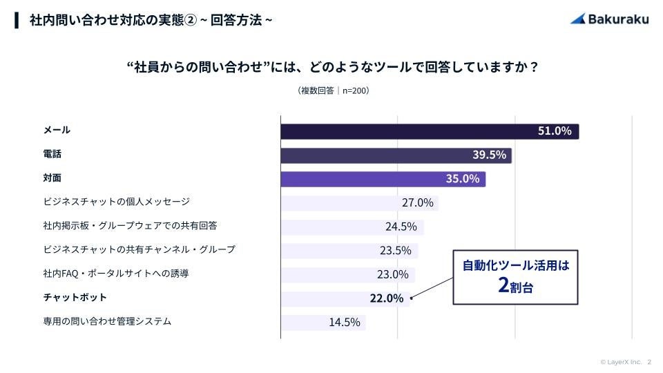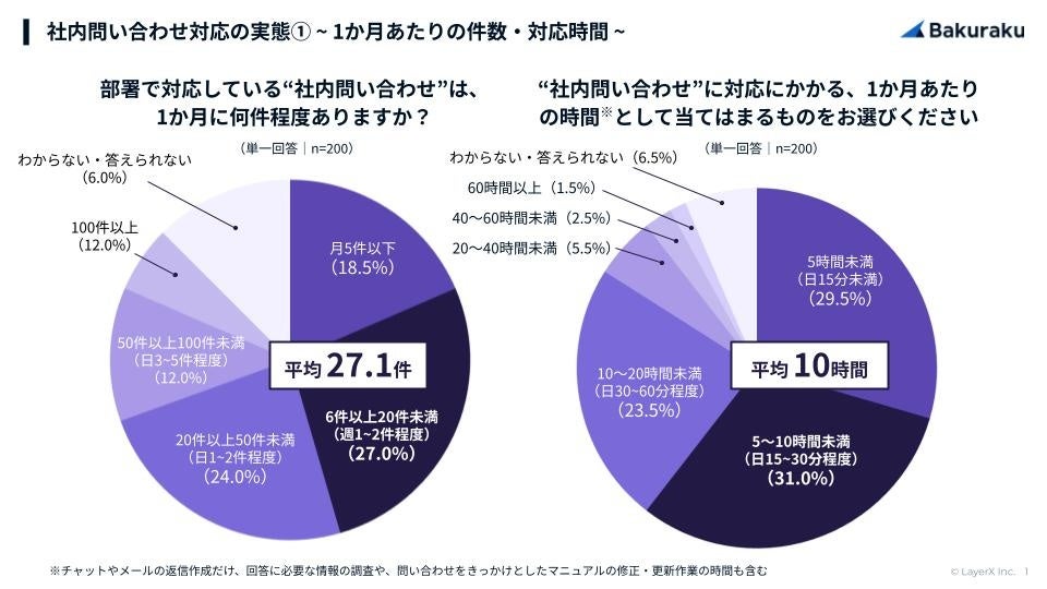 すべての経済活動のデジタル化を目指す株式会社LayerX(本社:東京都中央区、代表者:代表取締役CEO 福島良典、以下「LayerX」)は、従業員からの業務進行やツールの使い方などの質問に対応する(以下、「社内問い合わせ」)バックオフィス担当者(総務、人事・労務、経理・財務、法務、情報システム部門の担当者)200名を対象に、社内問い合わせ対応に関する実態調査を実施しました。