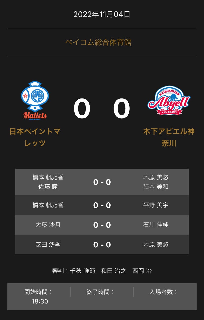 ノジマTリーグ 2022-2023シーズン 公式戦 11月04日開催 日本ペイントマレッツ vs 木下アビエル神奈川 オーダー発表