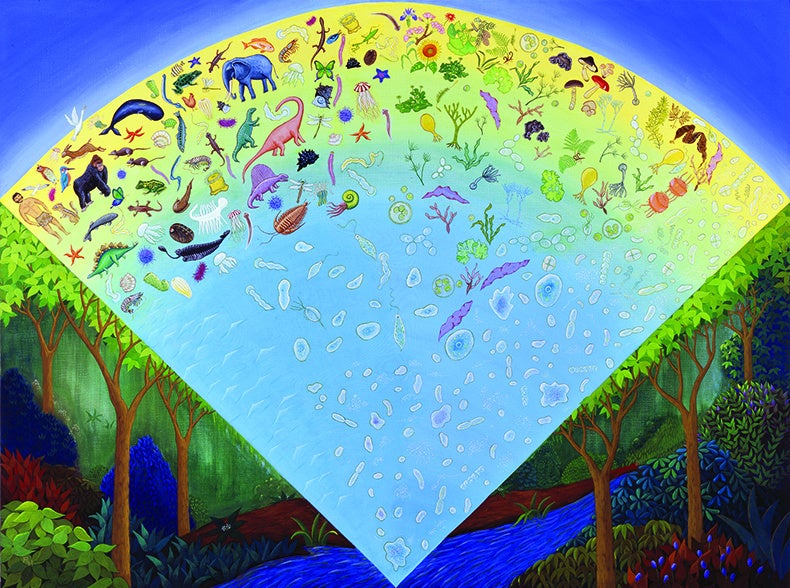 「生命誌」とは、人間も含めてのさまざまな生きものたちの「生きている」様子を見つめ、そこから「どう生きるか」を探す新しい知です。地球上の生きものたちは38億年前の海に存在した細胞を祖先とし、時間をかけて進化し多様化してきた仲間です。すべての生きものが細胞の中に、それぞれが38億年をどのように生きてきたかの歴史をしるすゲノムDNAを持っています。ゲノムDNAは、壮大な生命の歴史アーカイブです。その歴史物語を読み解き美しく表現することで、生きものの魅力を皆で分かち合い、生きることについて考えていく場が「研究館」“Research Hall”です。