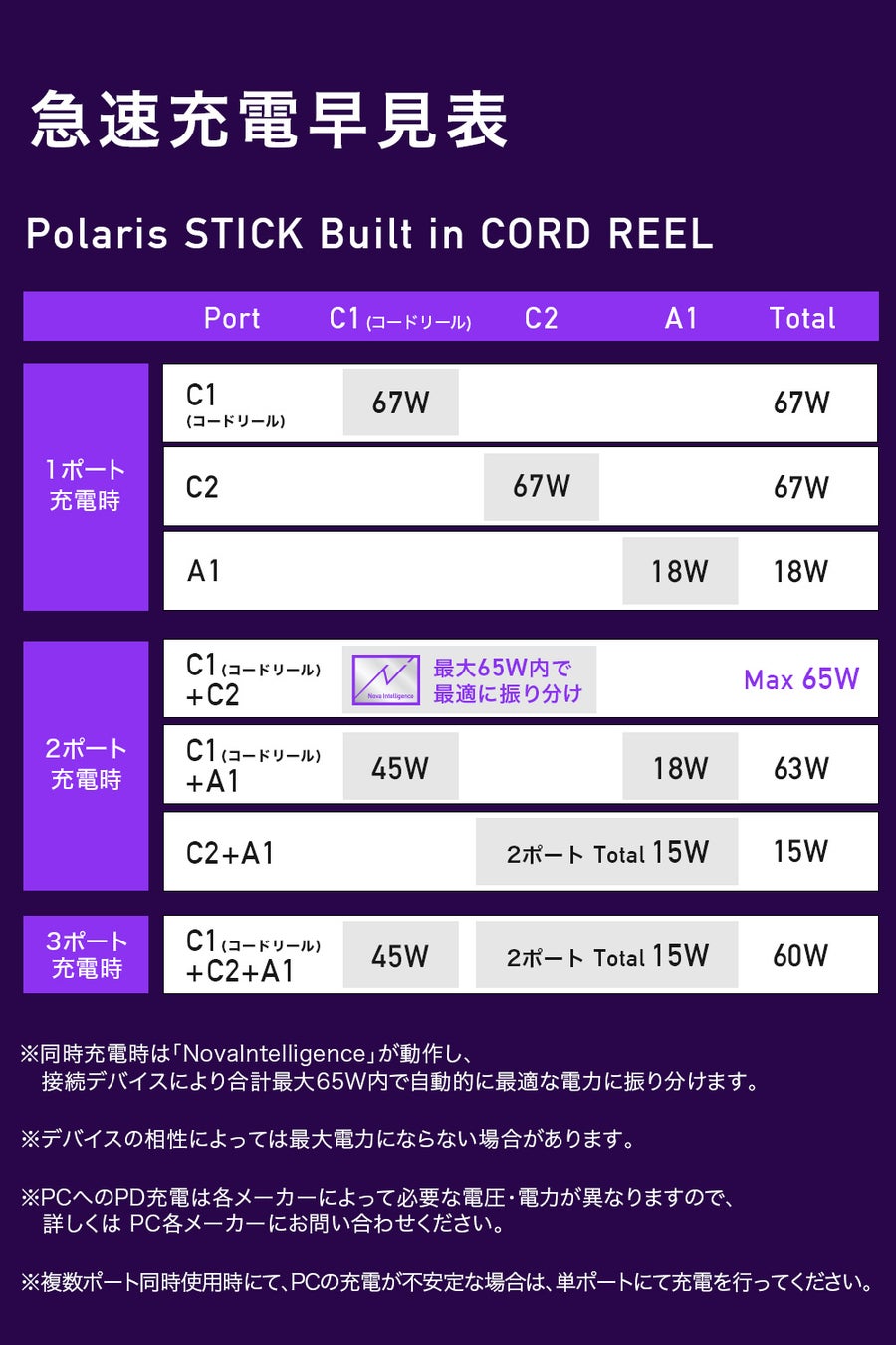 本体の端部は分離式になっており、単ポート最大67W出力に対応した充電器としても使用可能です。最長68cmのコードリールケーブルを内蔵し、必要な長さで使用でき、使い終われば自動で巻き取られてすっきり収納できます。ノートPCからタブレット、スマートフォンまで幅広く急速充電が可能です。2台同時に接続しても高出力を維持できるため、複数デバイス充電にも安心して利用できます。電源タップ機能と組み合わせることで、多様なシーンで効率的に充電を行えるのが特長です。
