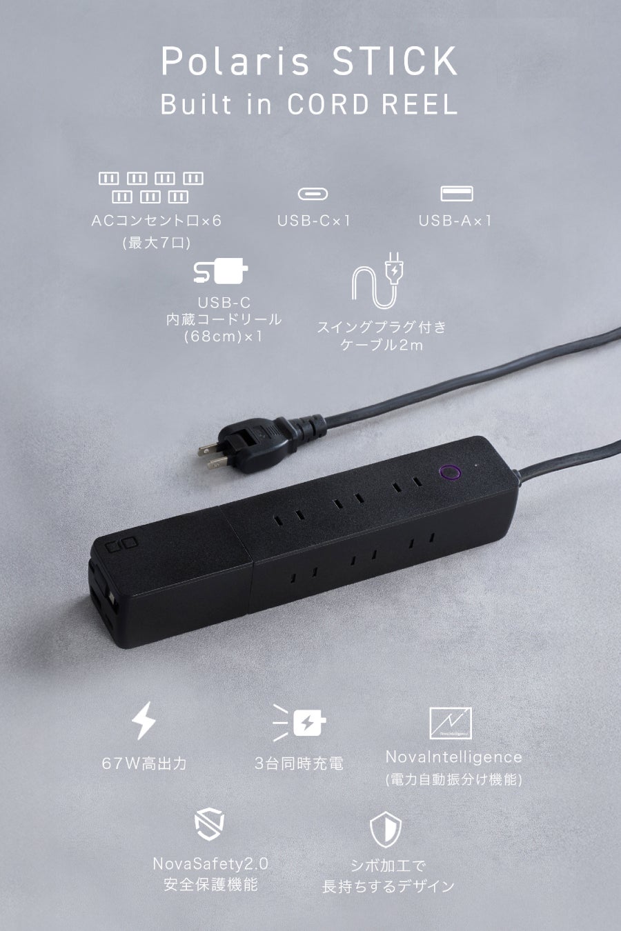 【株式会社CIO】 電源タップ・充電器・ケーブルを一体化した電源タップ『Polaris STICK Built in CORD REEL』を予約販売開始
