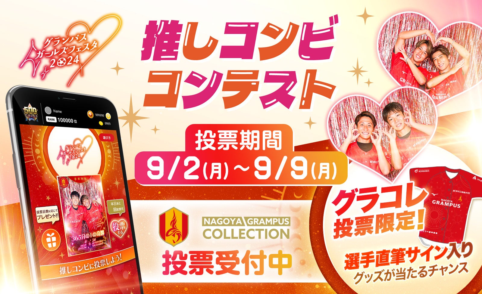 9月22日(日・祝)川崎フロンターレ戦で開催される「グランパス ガールズフェスタ2024」の企画として、グランパスファミリーの皆様が応援している「推しのグランパス選手コンビ」に投票いただきグランプリを決める「推しコンビコンテスト」が実施されます。