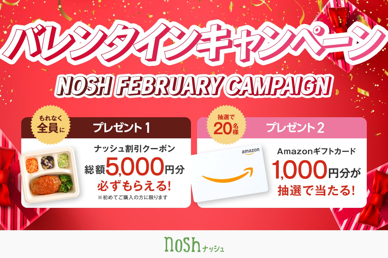 「世界中の人々が健康で豊かに生活できる未来を届ける。」をミッションに掲げ、手軽に美味しく栄養管理ができる冷凍宅配食サービス「nosh(ナッシュ)」を提供するナッシュ株式会社(本社:大阪市、代表取締役:田中 智也)は、2025年2月1日(土)から2月14日(金)までの間、新規ご購入のお客様を対象に総額5,000円分の割引クーポンをプレゼントするほか、Amazonギフトカード1,000円分が当たる「バレンタインキャンペーン」を開催します。