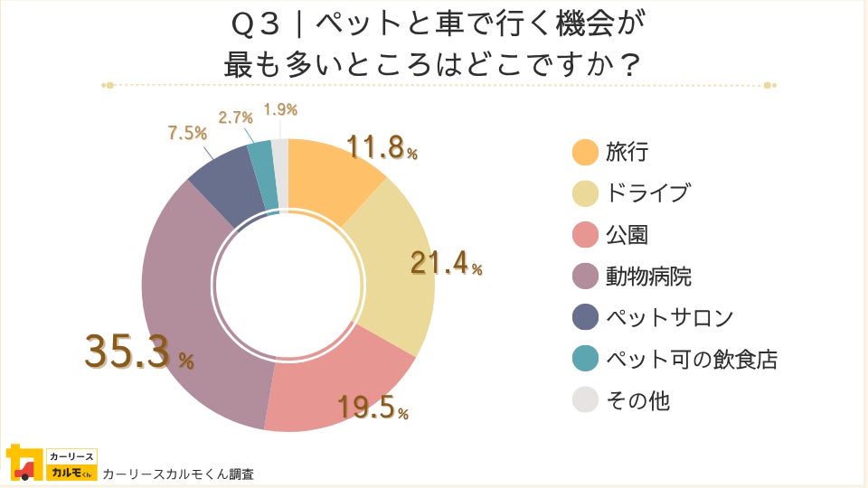 Q2でペットを車に乗せる機会が「ある」と回答した方に、行く機会が最も多い場所を聞いたところ、「動物病院」が35.3%で最多となりました。以下は「ドライブ」が21.4%、「公園」が19.5%、「旅行」が11.8%と続き、飼育するうえで必要な場所だけでなく、ペットが喜ぶ場所に連れて行ったり、ペットも家族の一員として思い出作りに出掛けたりする場面でも車が使用されていることがわかります。