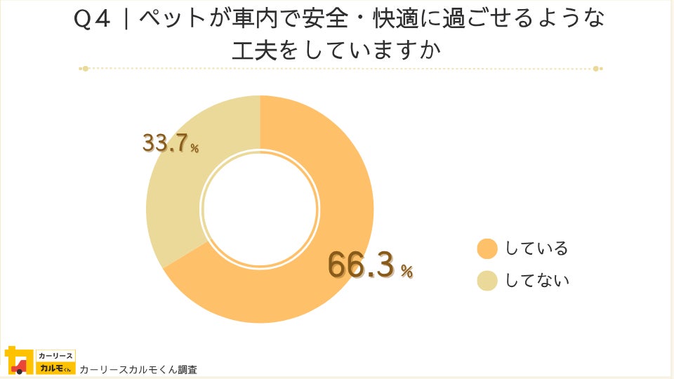 続いて、ペットが車内で安全・快適に過ごせるように何か工夫をしているかも聞いたところ、「している」と回答した方は66.3%、「していない」と回答した方は33.7%となり、約3人に1人が何かしらの工夫をしていることがわかりました。