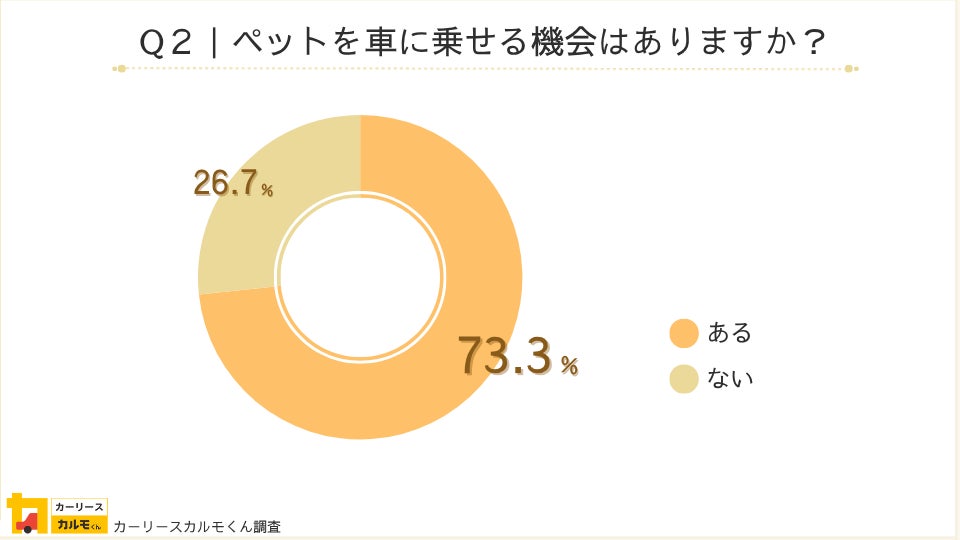 続いてペットを車に乗せる機会があるか聞いたところ、「ある」と回答した方は73.3%、「ない」と回答した方は26.7%で、7割以上の方がペットを車に乗せる機会があることがわかりました。
