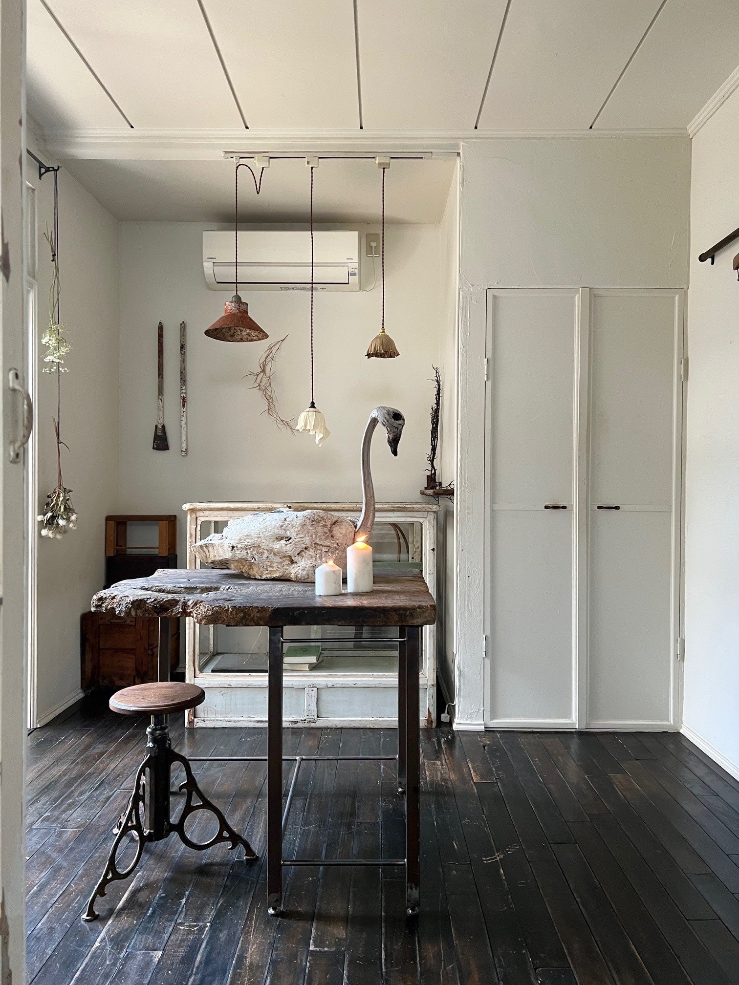 時間を経て風化し朽ちていく物の美しさに惹かれ、それを作品に留めたく流木や古材、廃材などの素材を使い制作しています。