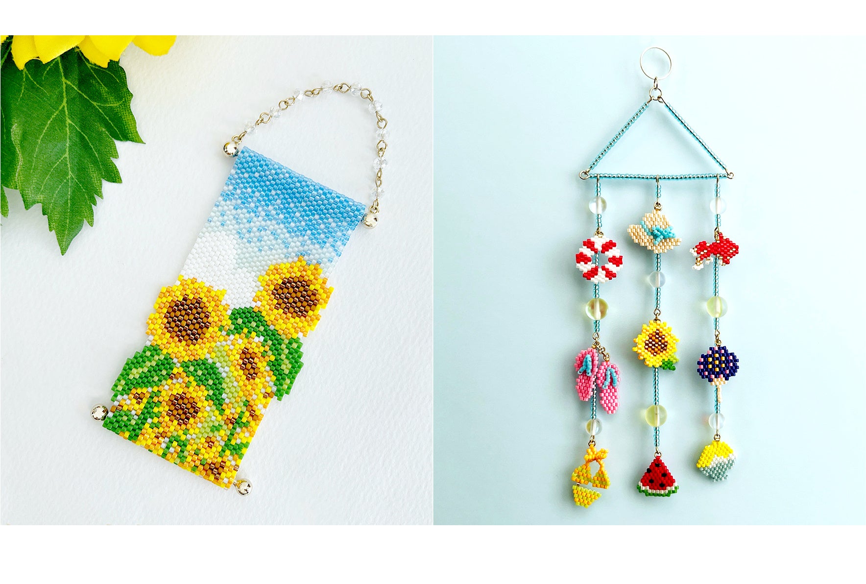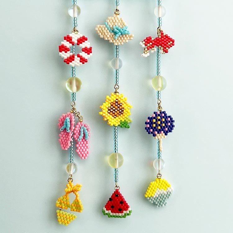浮き輪、ひまわり、スイカ、麦わら帽子、団扇、金魚、かき氷、水着、ビーチサンダルなど、夏休みの思い出を彩るモチーフ9種類をデリカビーズで編んで、3つずつ縦に繋ぎました。