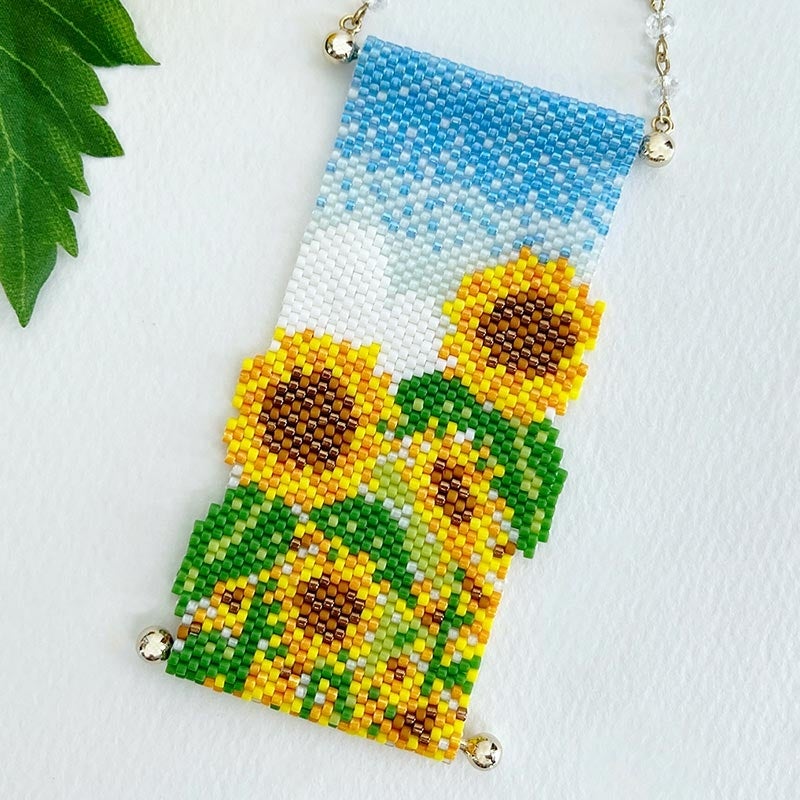 ビーズステッチの技法・ペヨーテステッチで作る、夏を代表する花・ひまわりが咲き誇るひまわり畑デザインのミニタペストリーキットです。