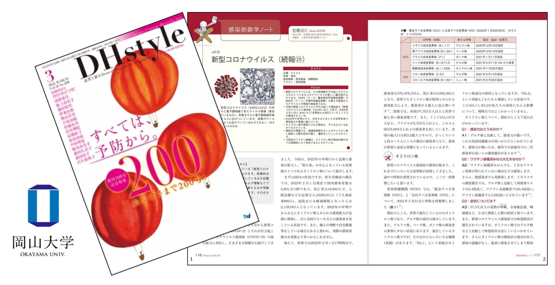 歯科総合出版社デンタルダイヤモンド社が発行している歯科衛生士向け月刊誌『DHstyle』に連載中の「感染制御学ノート」の新型コロナウイルス特集ページ(続報23)「オミクロン株について」を期間限定で一般公開中です!
