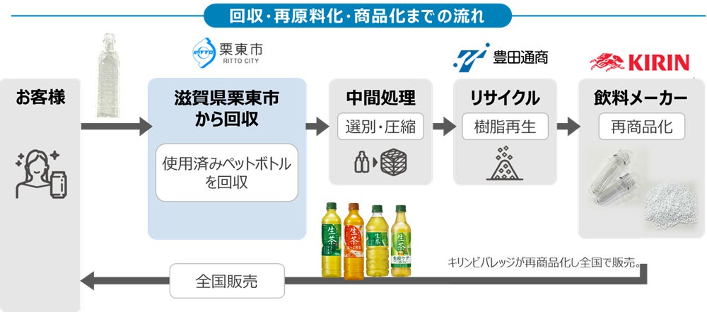 当社は、本協定の下、滋賀県栗東市で回収された使用済みペットボトルが、粉砕・洗浄などの工程を経て、リサイクラーである豊田通商株式会社にてリサイクルPET樹脂に再原料化されたものを、新たなペットボトルにリサイクルし当社の一部商品に使用します。
