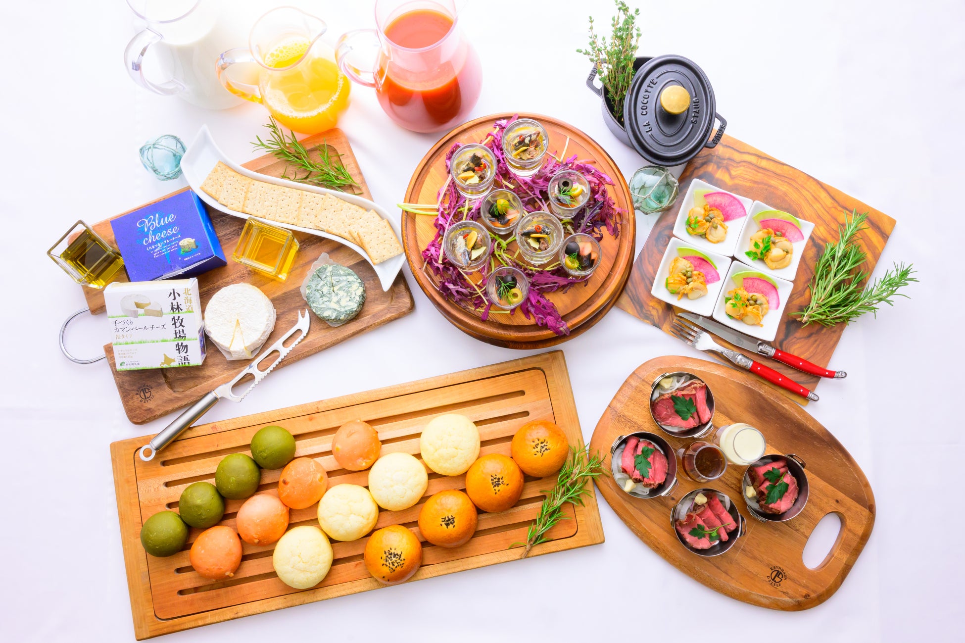 北海道産クリームチーズ、黒松内ブルーチーズ、小林牧場生乳使用カマンベールチーズ、富良野ワインチェダーなど北海道産チーズにこだわったラインナップを日替わりでご提供しております。クラッカーやパンにつけたり、はちみつとやフルーツと組み合わせたりと、ブッフェだからこその多様な楽しみ方ができます。