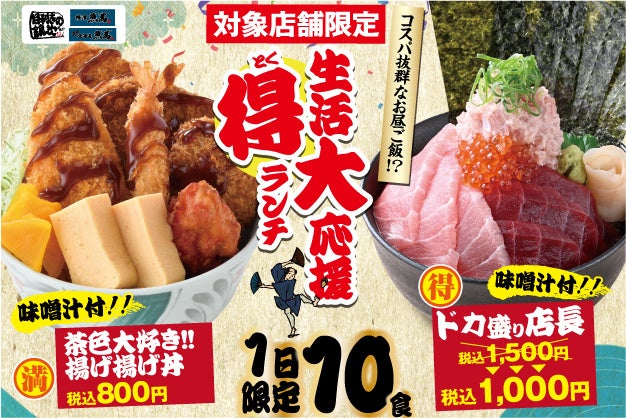 男性を中心に”揚げ物”好きにはたまらない、”茶色い揚げ物”をふんだんに盛り込んだ「揚げ揚げ丼」や”目利きの銀次”名物「ドカ盛り店長」(海鮮丼)がサービスタイム・1日10食限定、味噌汁付の衝撃価格で登場!