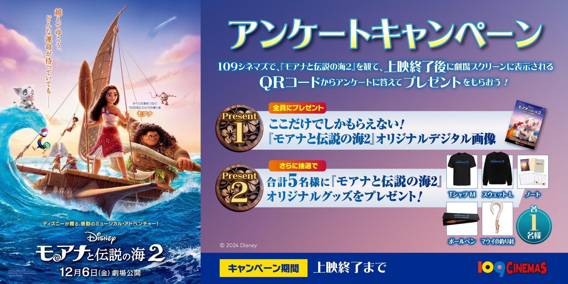 109シネマズでは、映画『モアナと伝説の海2』と映画『ライオン・キング:ムファサ』を観て、上映終了後に劇場スクリーンに表示されるQRコードからアンケートに答えると、プレゼントがもらえるキャンペーンを実施いたします。