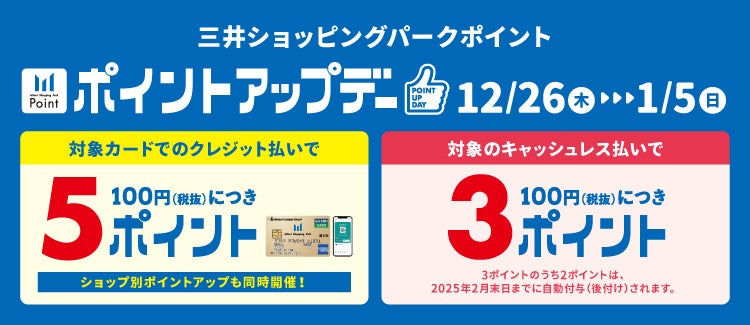 三井ショッピングパークカード《セゾン》会員限定のポイントアップデーを一部店舗にて開催。対象カードでのクレジット払いで、購入金額100円(税抜)につき通常2ポイントのところ、100円につき5ポイントたまります。対象のキャッシュレス払いでは、100円につき3ポイント!さらにラゾーナでは25店舗以上がショップ別ポイントアップを同時開催します。最大10ポイントとなる店舗も!