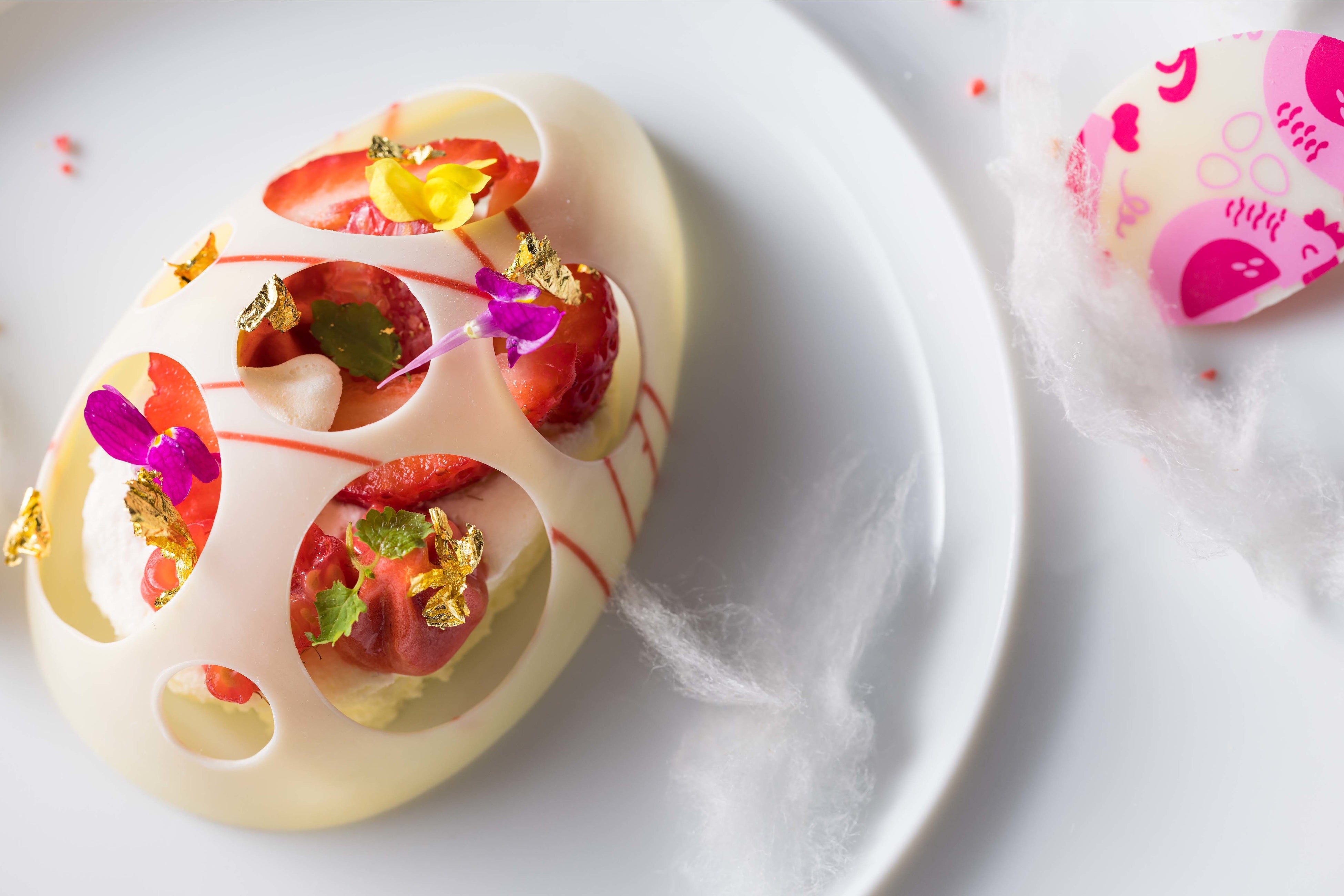 商品詳細:イースターエッグに見立てたチョコレートの中に、軽やかなクレームダンジュと苺のソルベが隠れた華やかな新作デザート。周りには苺と相性の良い酸味がアクセントのカルピスを使ったコットンキャンディーが漂います。仕上げにベリーのソースをかけると顔を出す、苺や花々に春の訪れを表現しました。