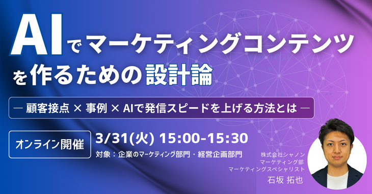 株式会社シャノン(本社:東京都港区、代表取締役CEO:山﨑 浩史)は、3月31日(火) に生成AIでナレッジをコンテンツにする方法をご紹介するセミナーを開催いたします。