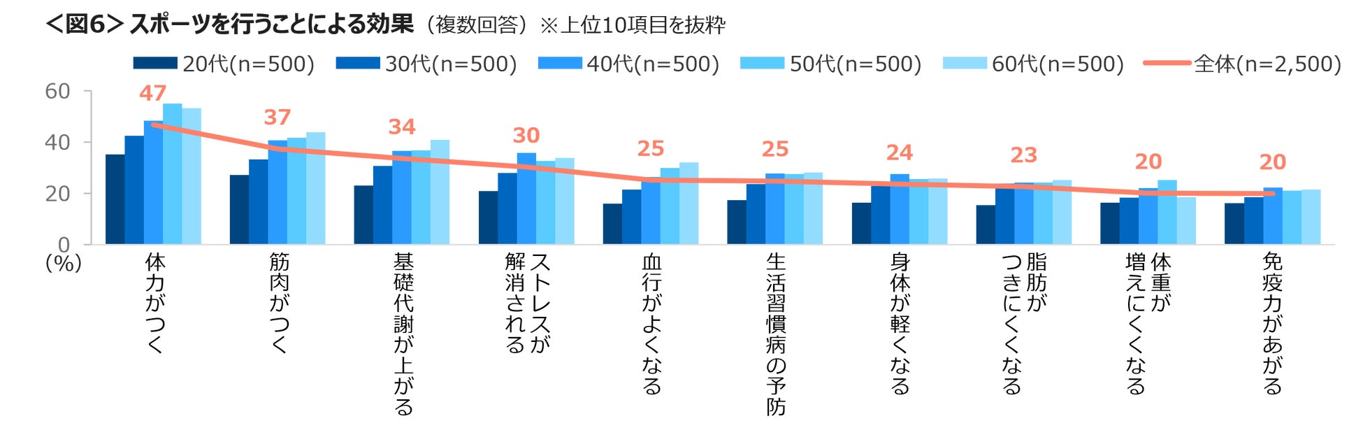スポーツを行うことで「体力がつく」が47%と高く、「筋肉がつく」「基礎代謝が上がる」「ストレスが解消される」が3割台で続く。全般的に年齢が上がるほど効果はあると回答している割合が高まる。<図6>