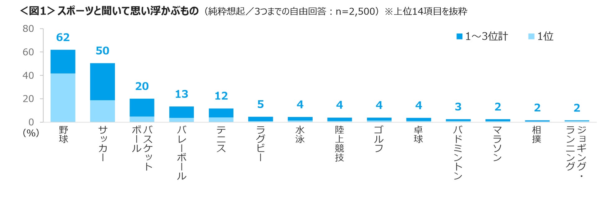 スポーツと聞いて思い浮かぶもの(純粋想起)を自由回答にて確認した結果、「野球」は62%、「サッカー」が50%と2強、次いで「バスケットボール」「バレーボール」「テニス」があがった。<図1>