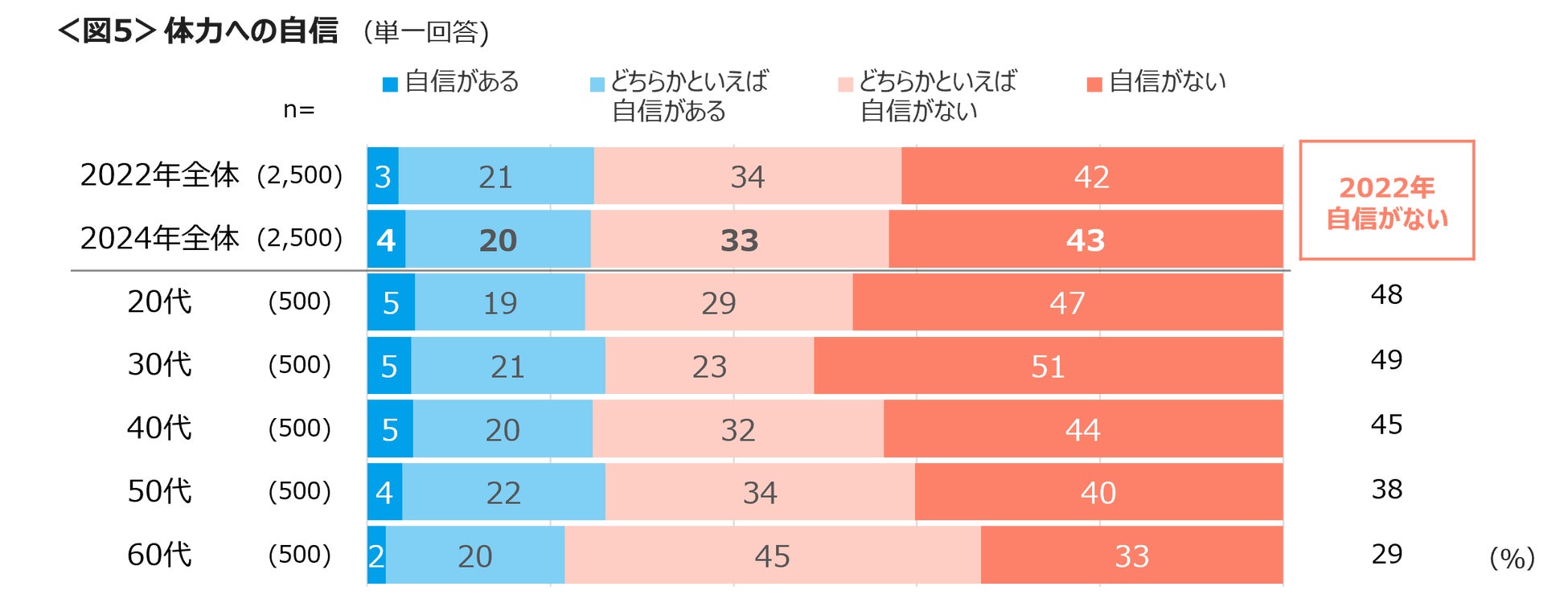 自身の体力について「自信がある+どちらかといえば自信がある」は24%と2年前と変わらない。4段階評価のボトムBOXである「自信がない」は30代で51%、20代が47%と2年前と同様に若い年代が高い。子どもの頃からゲームやスマートフォンが身近にある生活で、意識をしないと体を動かす機会が少なく、それが体力の自信のなさにつながっていると推察される。<図5>