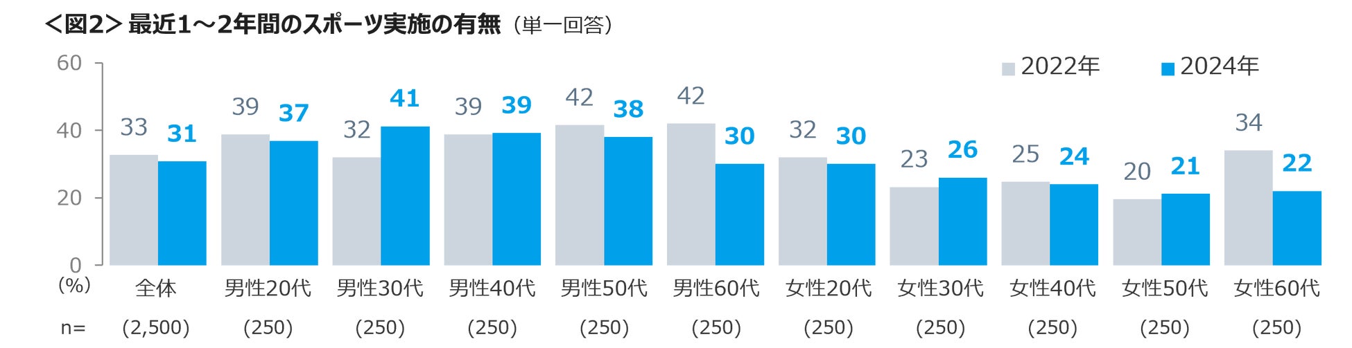 38種類のスポーツを呈示し、最近1~2年間のスポーツ実施経験を確認した。スポーツ実施率は31%と2年前と変わりはない。男性の実施率は高く、特に男性30代は41%と2年前より9pt上昇。一方、2022年はコロナ禍でもあり、健康面を考慮したのか実施率が比較的高めだった男女ともに60代の実施率の低下が目立った。<図2>