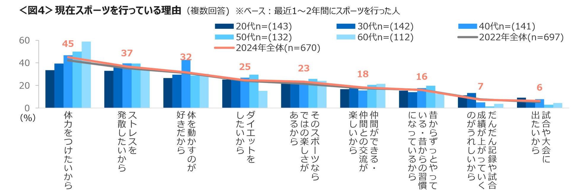 スポーツを行っている理由は「体力をつけたい」「ストレスを発散したい」「体を動かすのが好き」がTOP3。60代は「体力をつけたい」、40代は「体を動かすのが好き」の割合が高い。<図4>