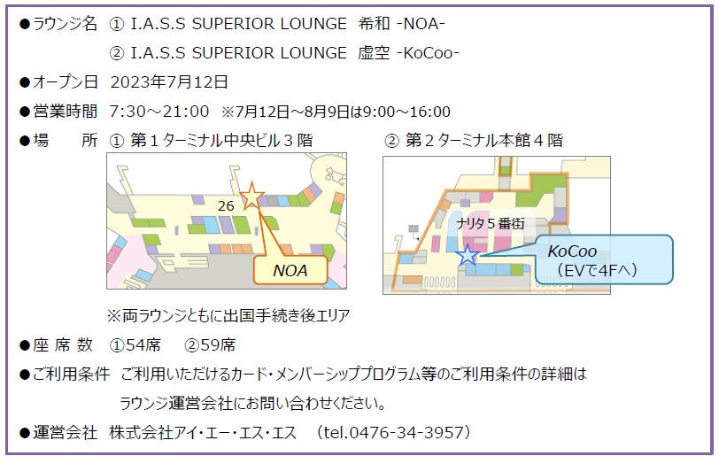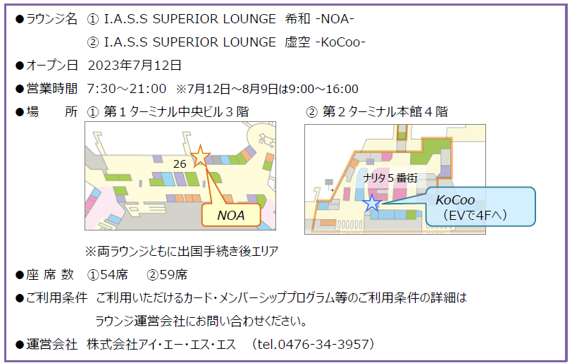 2023年7月12日、第1・第2ターミナルの出国手続き後エリアにクレジットカード会社ラウンジがオープンいたします。「日本らしさを感じていただける空間」をコンセプトに、あたたかいお食事やデザートの他、各種ソフトドリンク、アルコール類も厳選されたこだわりの逸品をお楽しみいただけます。充実したサービスでご出発前のひとときを快適にお過ごしください。