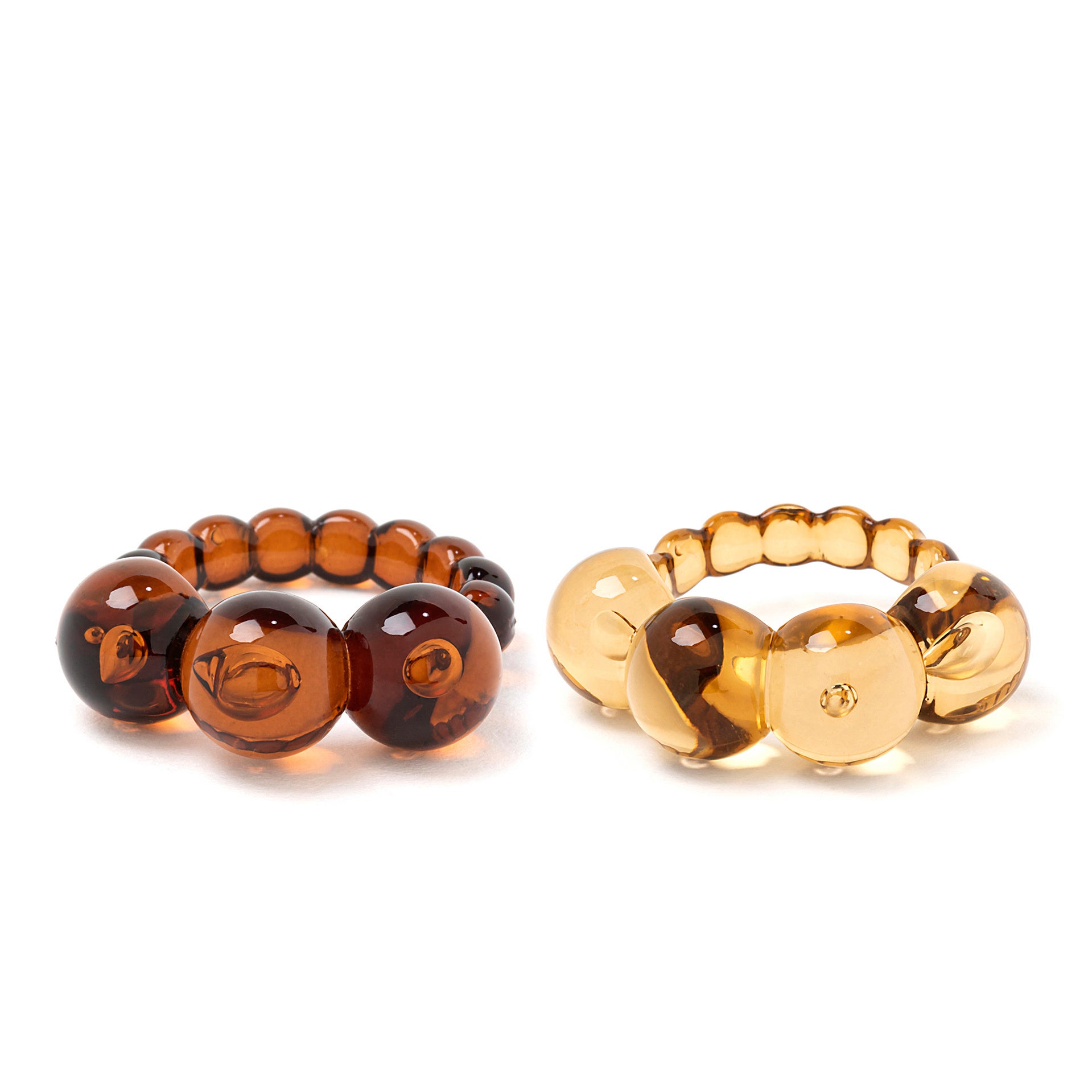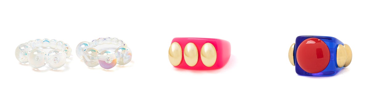 左から順番に:BURBJAS RING ¥8,470(税込) COL:全5色,SIZE:F / Knuckle Duster RING ¥8,470(税込) COL:全2色,SIZE:F / SQUARE RING ¥9,680(税込) COL:全8色,SIZE:S,M