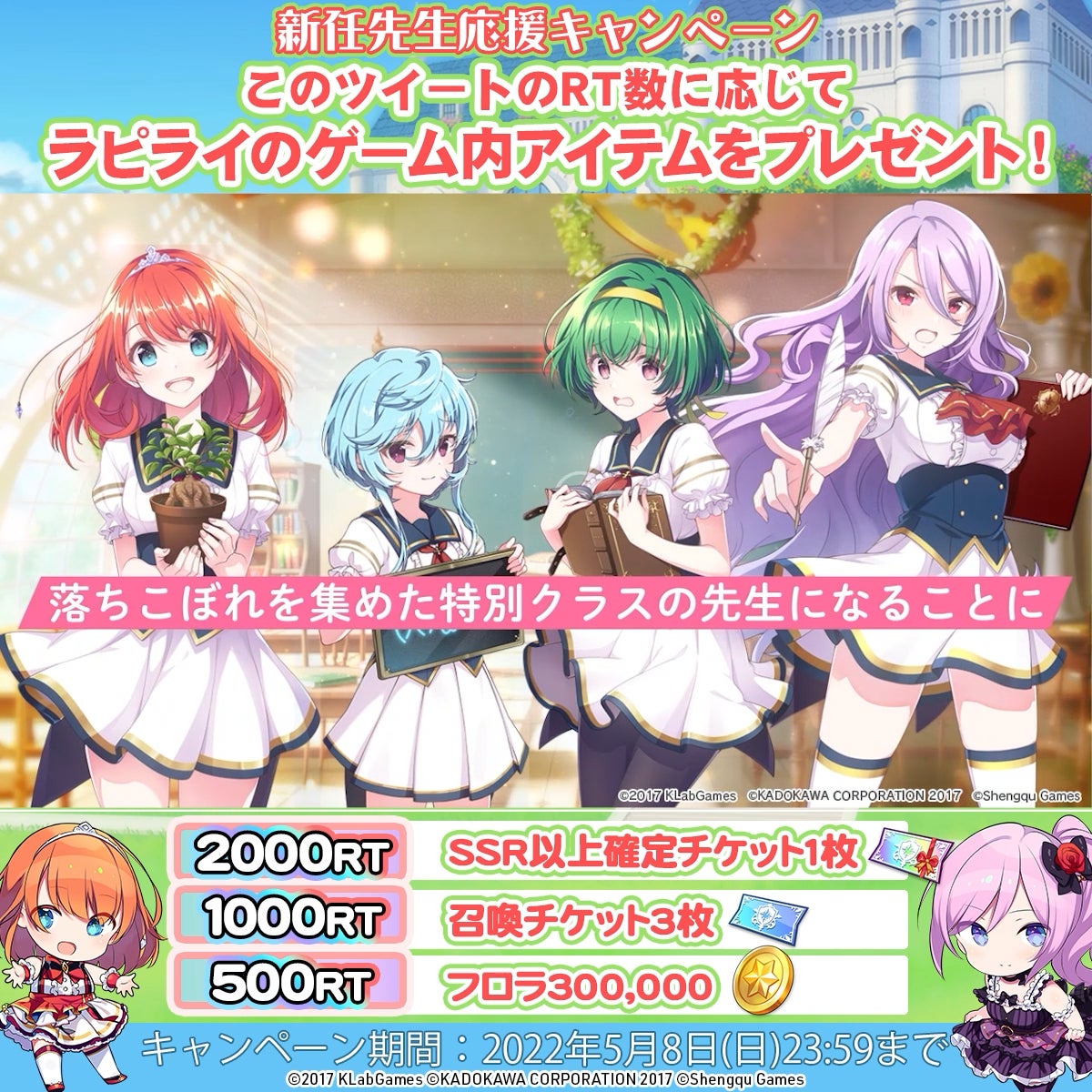 KLab株式会社(本社:東京都港区、代表取締役社長:森田英克、以下「KLab」)と株式会社KADOKAWA(本社:東京都千代田区、代表取締役社長:夏野剛、以下「KADOKAWA」)による、「魔法」×「アイドル」をテーマとしたメディアミックスプロジェクト『ラピスリライツ ~この世界のアイドルは魔法が使える~』(以下、『ラピスリライツ』)にて、本日4月28日(木)18時よりゲーム公式Twitterにて「新任先生応援キャンペーン」を開催いたします。
